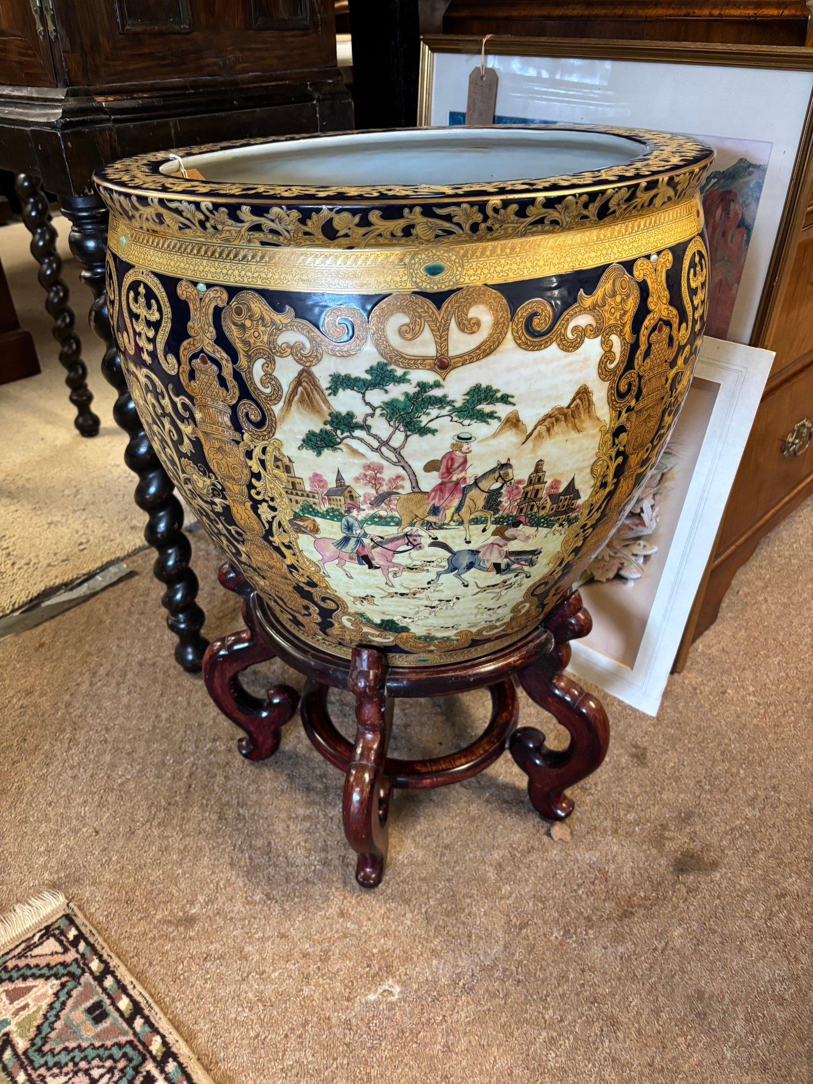 A large Chinese porelain fish bowl with Koi carp decorated inside, comes with a strong wooden stand.