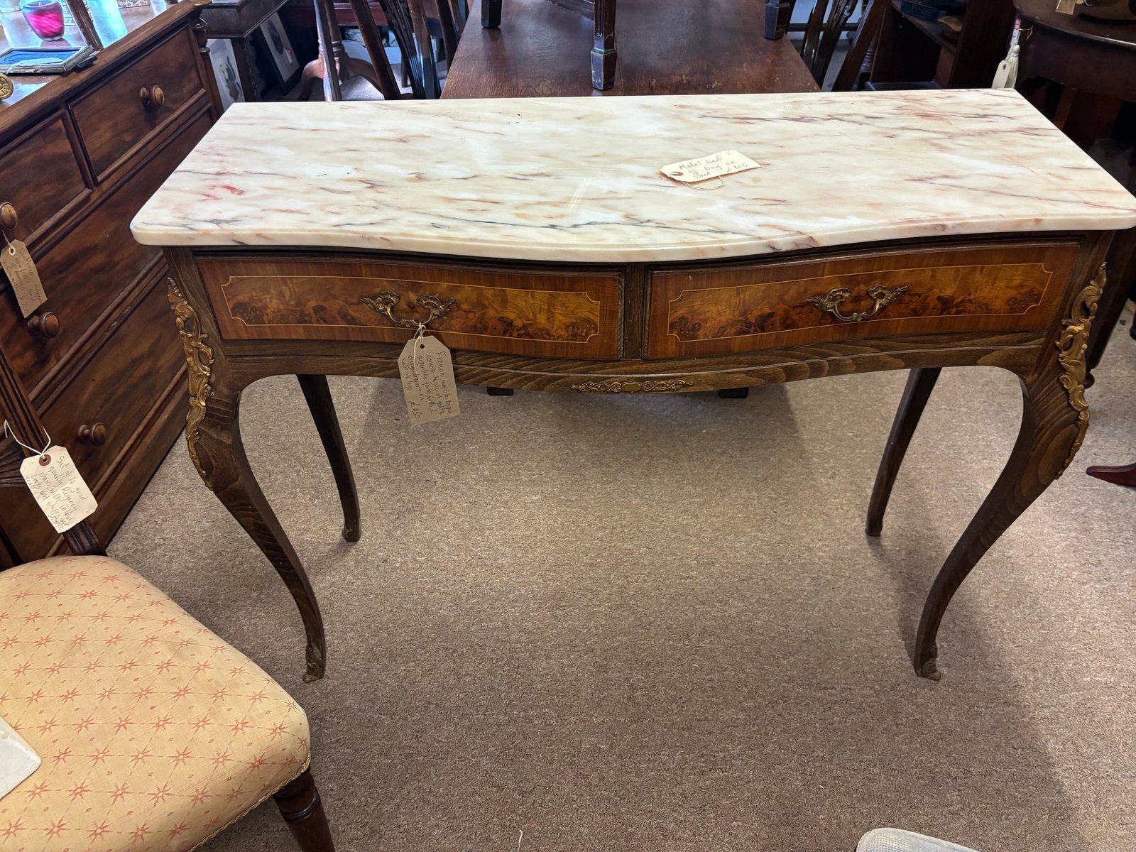 French marble topped console table of gentle serprntine form, two drawers on cabriole legs in good condition for age. Would make a lovely entrance hall table.