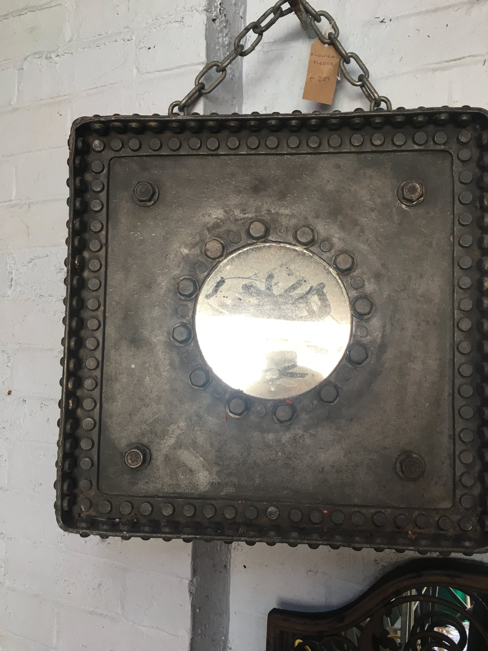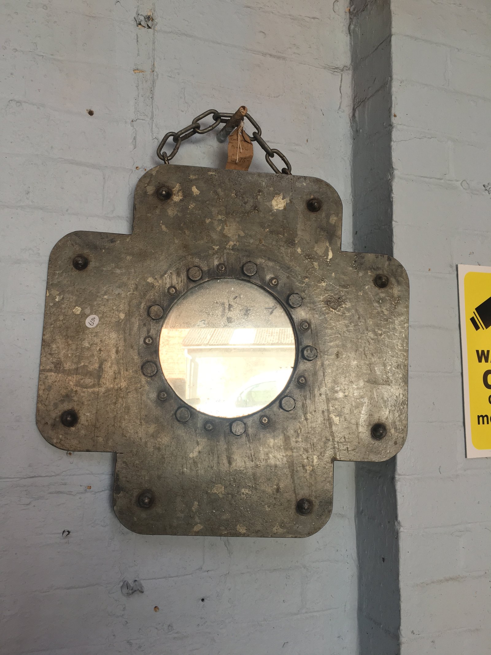 Sold as a pair two large heavy industrial mirrors made from galvanised metal, with galvanised rivets. Hanging on chains. Ideal for retail or home