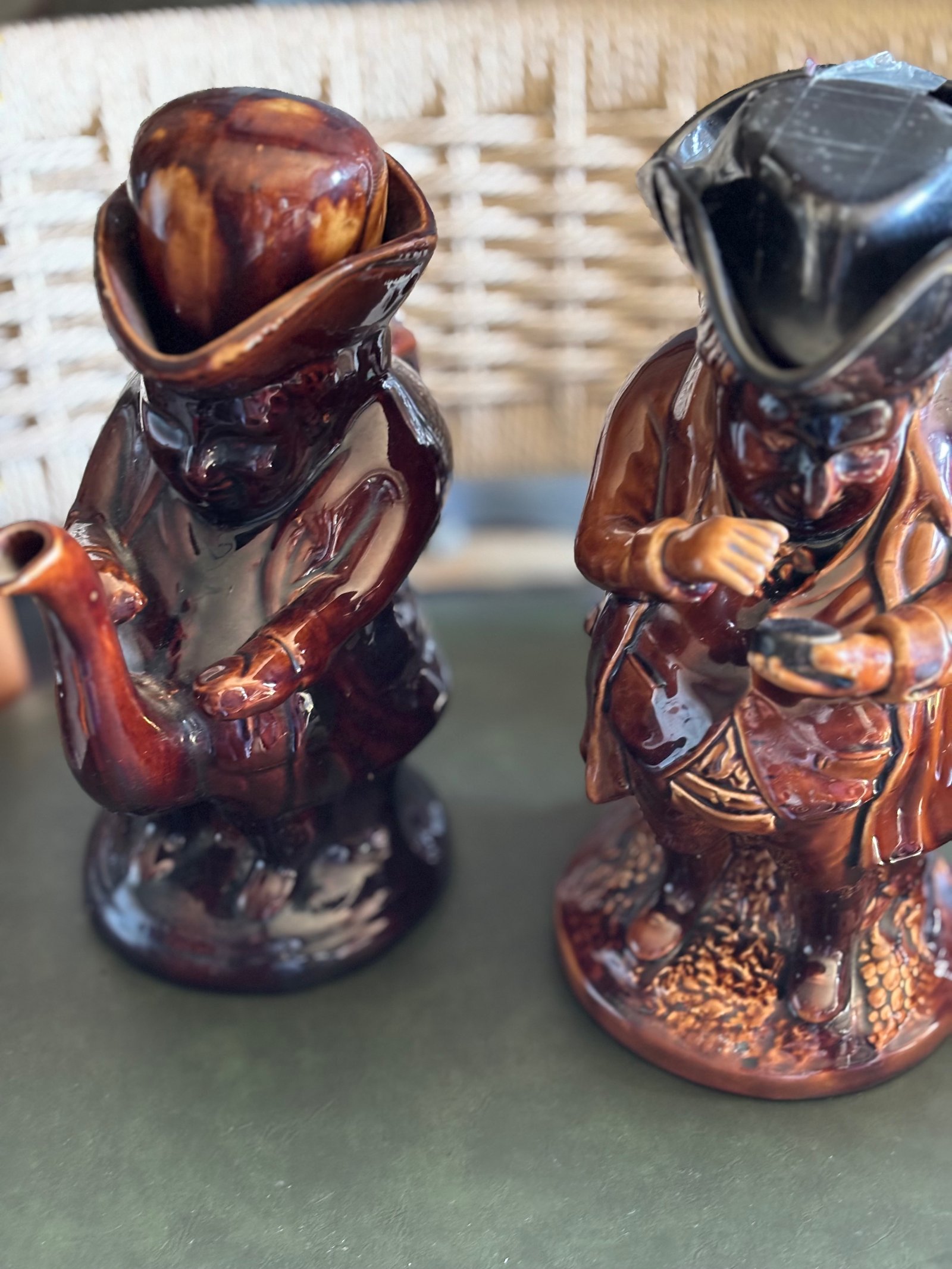 A charming pair of treacle‑glazed Toby jugs one snuff taker and the other a tea pot in excellent vintage condition. Rich, glossy brown glaze with great character and detail. No chips or cracks, both with their hat lids Ideal for collectors of Toby ware, traditional British ceramics, or rustic home décor. A handsome pair ready for display.