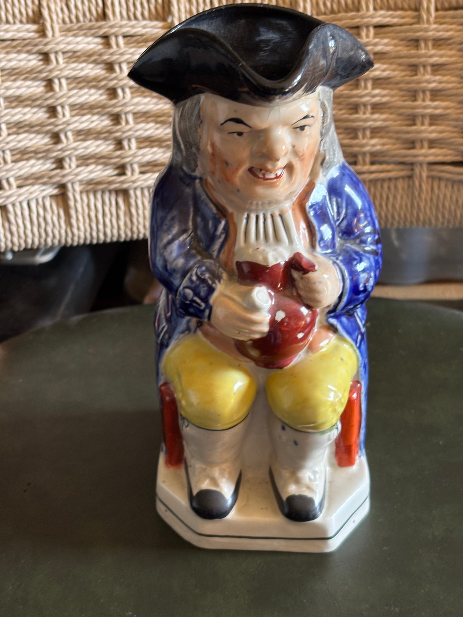 For sale a common Victorian Toby Jug 19th‑century continuation of the classic English Toby jug tradition—still rooted in the jovial, ale‑loving character of the 18th century, but with more variety, brighter colours, and mass‑production techniques that made them widely available. Victorian examples are some of the most commonly collected today, and they sit right between the rare early Ralph Wood pieces.